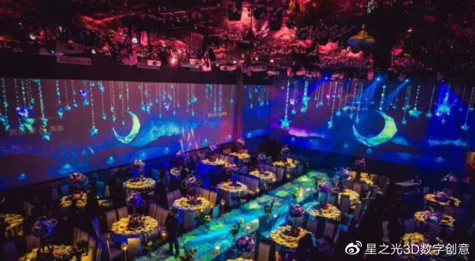 270度立體影像是利用投影技術(shù)和三維動畫技術(shù),利用宴會廳墻壁作為投射媒介,實(shí)現(xiàn)了宴會大廳的三維動態(tài)三維影像。三維影像在全息宴會大廳中是一個靈活多變的空間,能夠滿足各種需要。