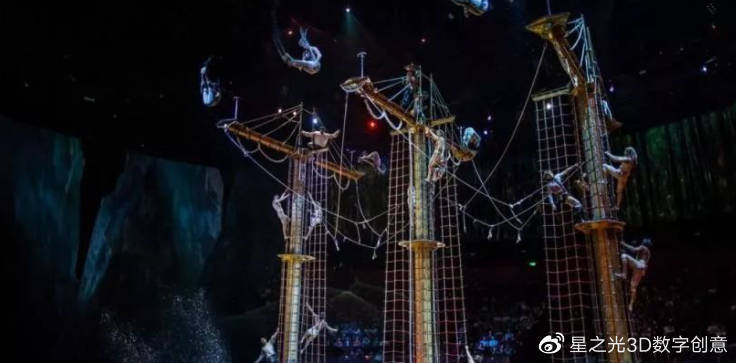整個舞臺可以裝下275萬升的水,在表演的過程中,兩側(cè)的瀑布從兩側(cè)流淌下來,與地面上的水滴碰撞,形成了一場壯觀的暴雨,演員們跳到了舞臺中間的池塘里,施展“水上功夫”,讓觀眾們看得目瞪口呆,或者從二十多米的高空一躍而下,展現(xiàn)出了極致的魅力。